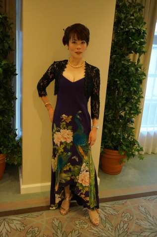 紫のクジャクのロングドレスは大正末期の振袖をリメイクしたものです。
